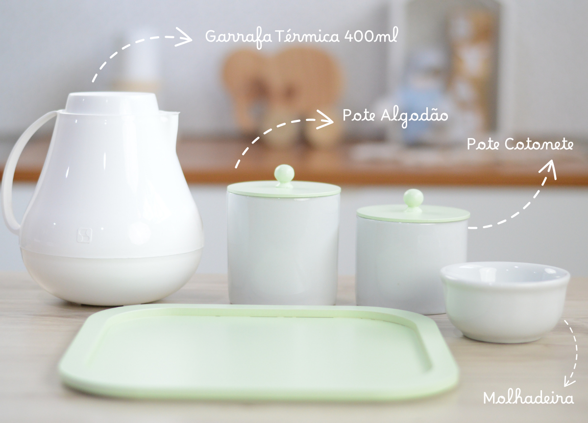 Kit Higiene Bebê Quarto Infantil Potes Porcelana Algodão Cotonete Verde Unissex Moderno