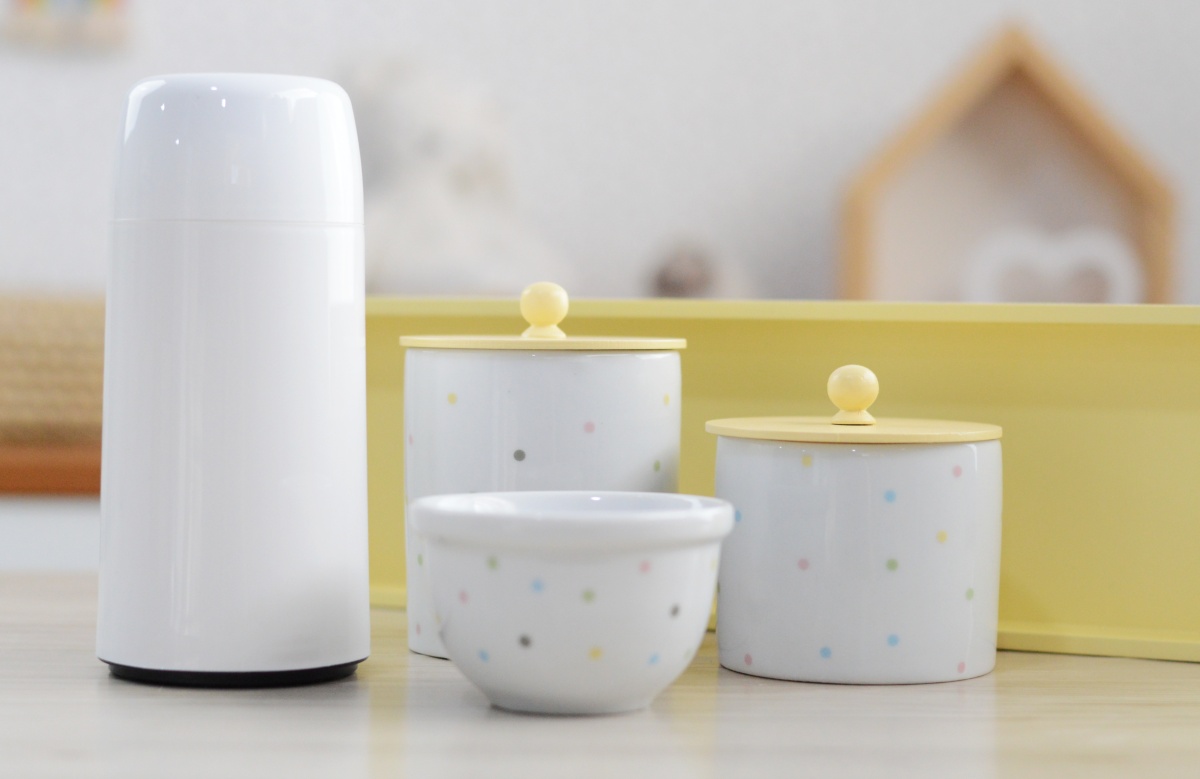 Kit Higiene Porcelana Bebê Maternidade Poa Colorido Bandeja + Potes + Garrafa Térmica - Amarelo
